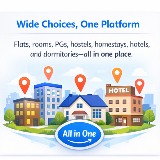 Flats, rooms, PGs, hostels, homestays, hotels, and dormitories—all in one place.